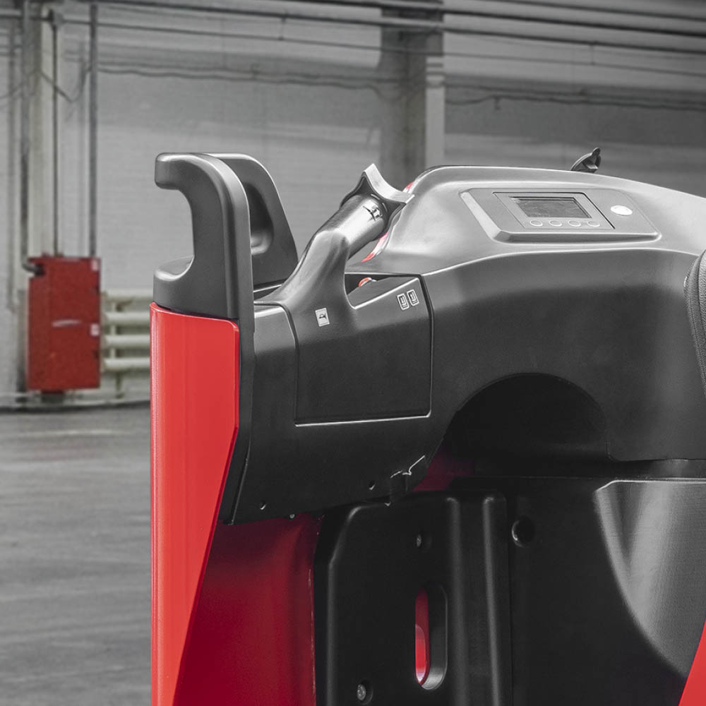 Display instrument with wheel position indication for easy operator judgment of travel direction. Various fork spread and fork lengths available to accommodate multiple pallet types.